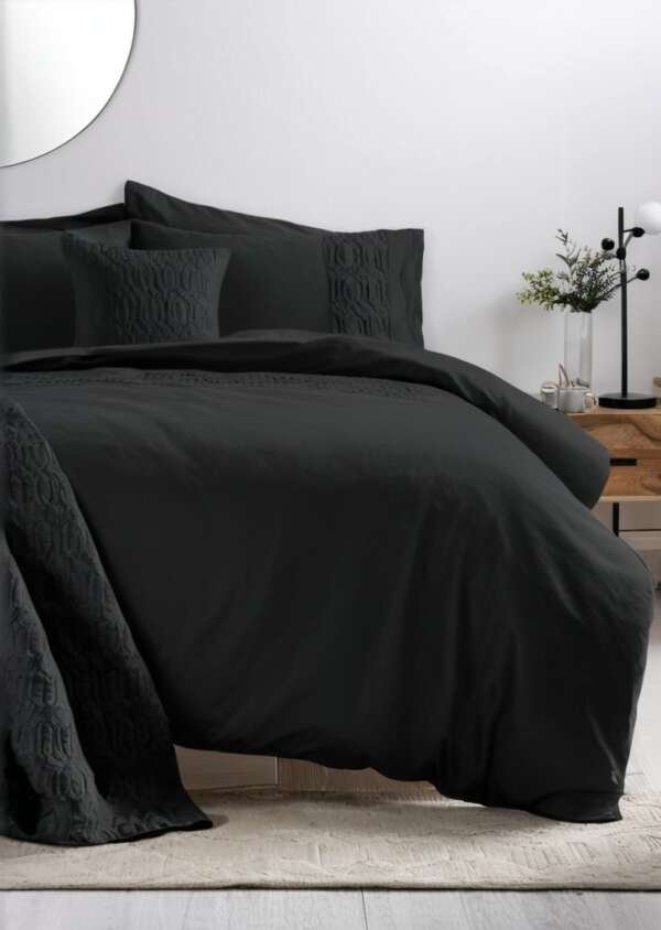 Ta czarna pościel jest wykonana z wyjątkowo jedwabistego materiału, dziąki czemu za każdym razem poczujesz sią jak w nowym prześcieradle. Wykończony geometrycznymi panelami pinsonicznymi, bądzie wyglądał idealnie w każdej sypialni, niezależnie od jej wystroju. Ten zestaw kołder zawiera jedną pasującą poszewką na poduszką w rozmiarze pojedynczym i dwie pasujące poszewki na poduszki w rozmiarze podwójnym i królewskim.
