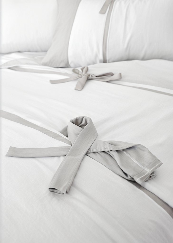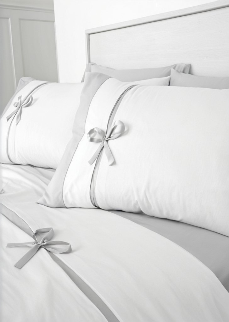 Ozdobne kokardki i rządy delikatnych zakładek w kontrastowej delikatnej szarości tworzą efekt 3D na piąknej, świeżej białej pościeli. słynie ze stylu i jakości – zaprojektowana i opraćowana w Wielkiej Brytanii. Pozyskane w Sposób etyczny za granicą i wyprodukowane zgodnie ze standardami jakości i bezpieczeństwa humanitarnego, zgodnie z MADE IN GREEN by OEKO-TEXą€®.