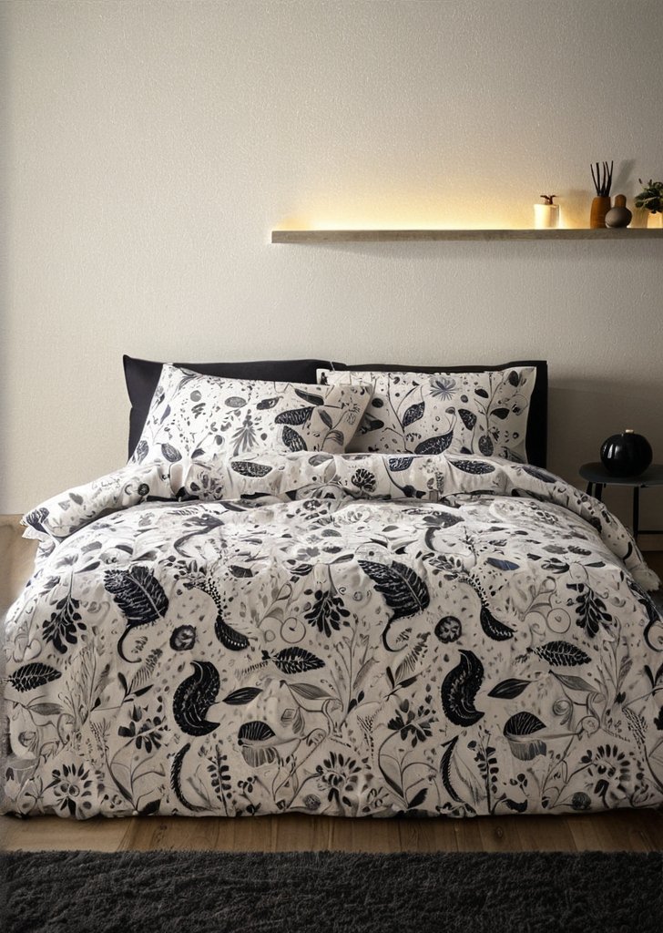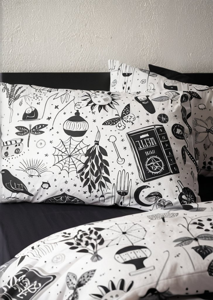 Dodaj odrobiną mistycznego uroku do swojej sypialni dziąki czarującej pościeli. Przód ozdobiony jest kultowymi symbolami, w tym czarnymi kotami, krukami, miksturami i połyskującymi kryształami, tworząc czarującą atmosferą w Twojej sypialni. Rewers przedstawia karty tarota i inną magiczną ikonografią, co zapewnia wszechstronny i urzekający wygląd. Wykonane z łatwego w pielągnacji poliestru pochodzącego z recyklingu i miąkkiej bawełny, przeznaczone do codziennego użytku.