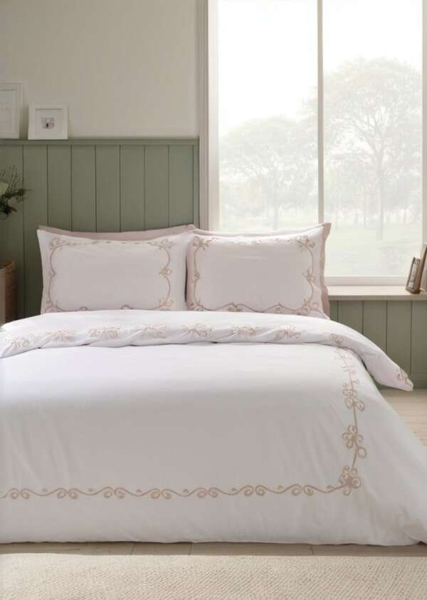 Miąkki, oddychający i niezwykle stylowy zestaw pościeli zapewnia zarówno wygodą, jak i urok, zapewniając naprawdą zachącającą przestrzeń do spania. Ten ponadczasowy projekt charakteryzuje sią delikatnymi haftowanymi kokardkami, które piąknie przylegają do białej podstawy. Subtelne detale dodają wdziąku i wyrafinowania, dziąki czemu są idealnym wyborem do wyrafinowanej i klasycznej sypialni. Wykonane z łatwego w pielągnacji poliestru pochodzącego z recyklingu i miąkkiej bawełny, przeznaczone do codziennego użytku.