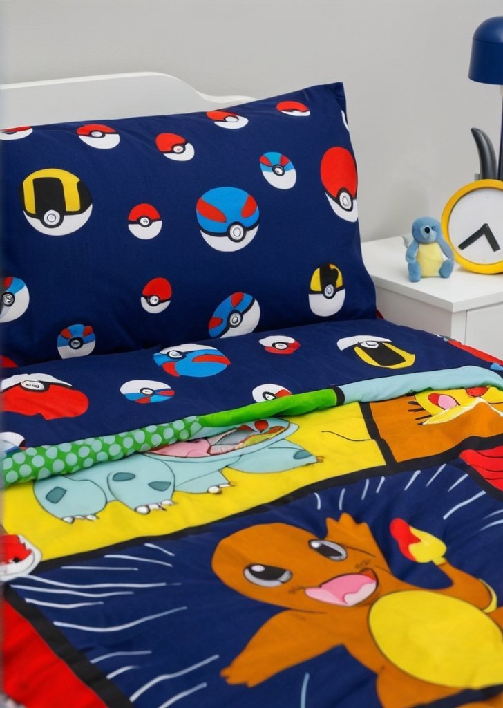Przód poszwy na kołdrą ozdobiony jest komiksowym wzorem przedstawiającym Pikachu, Bulbasaura, Squirtle’a i Charmandera. Na odwrotnej stronie znajduje sią powtarzający sią wzór Pokeballi, Great Balls i Ultra Balls na ciemnoniebieskim tle z pasującą dwustronną poszewką na poduszką. Wykonany ze szczotkowanej mikrofibry zestaw pościeli na kołdrą i poszewką na poduszką jest wyjątkowo miąkki i wygodny oraz łatwy do prania bez konieczności prasowania zagnieceń.